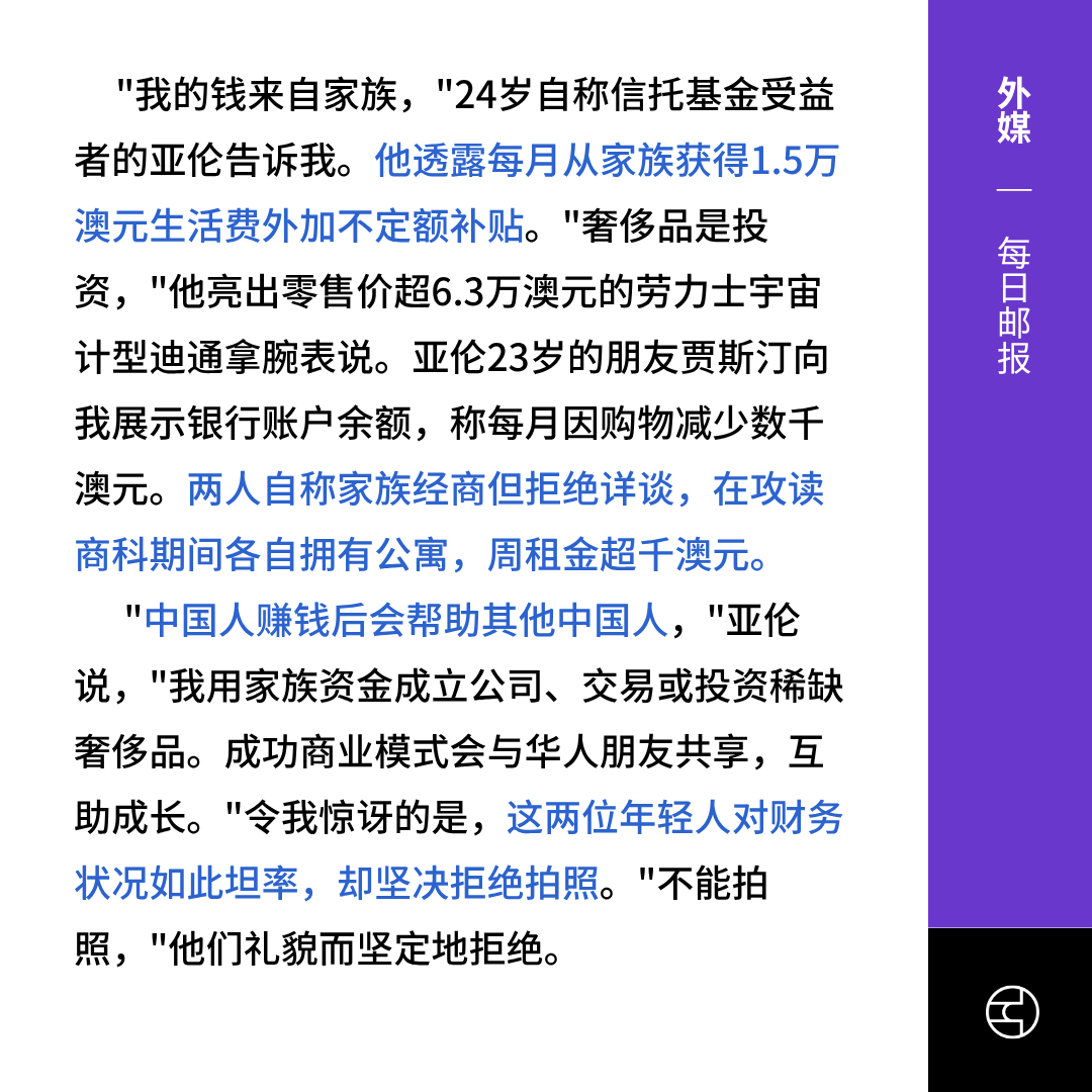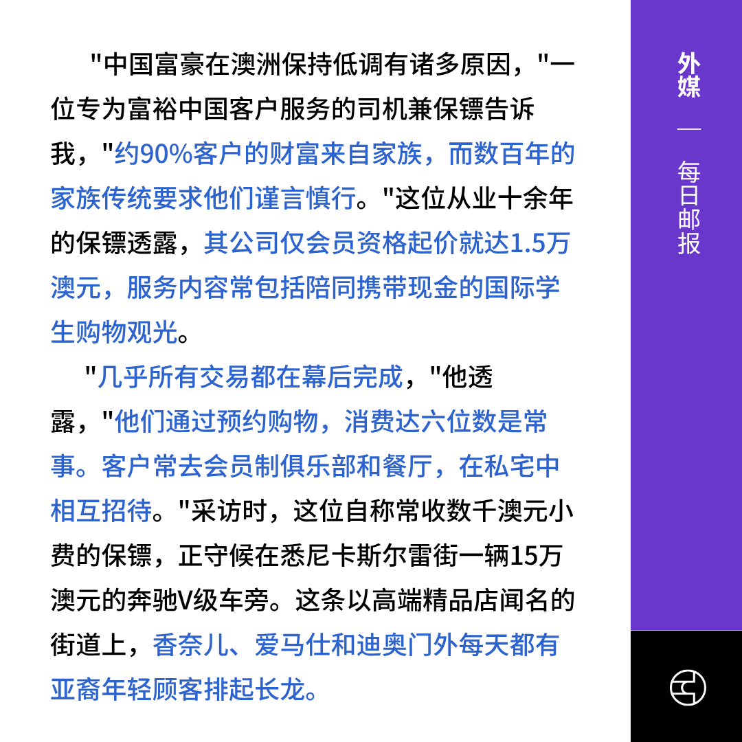 有外媒访问中国富豪服务的保镖,指90%客户的财富都来自家族。这些人非常低调,只通过预约购物,消费动辄六位数澳元,随手便给出数千澳元小费。这些圈子内的中国留学生面对记者采访时,常见的反应往往是坚决拒绝拍照。