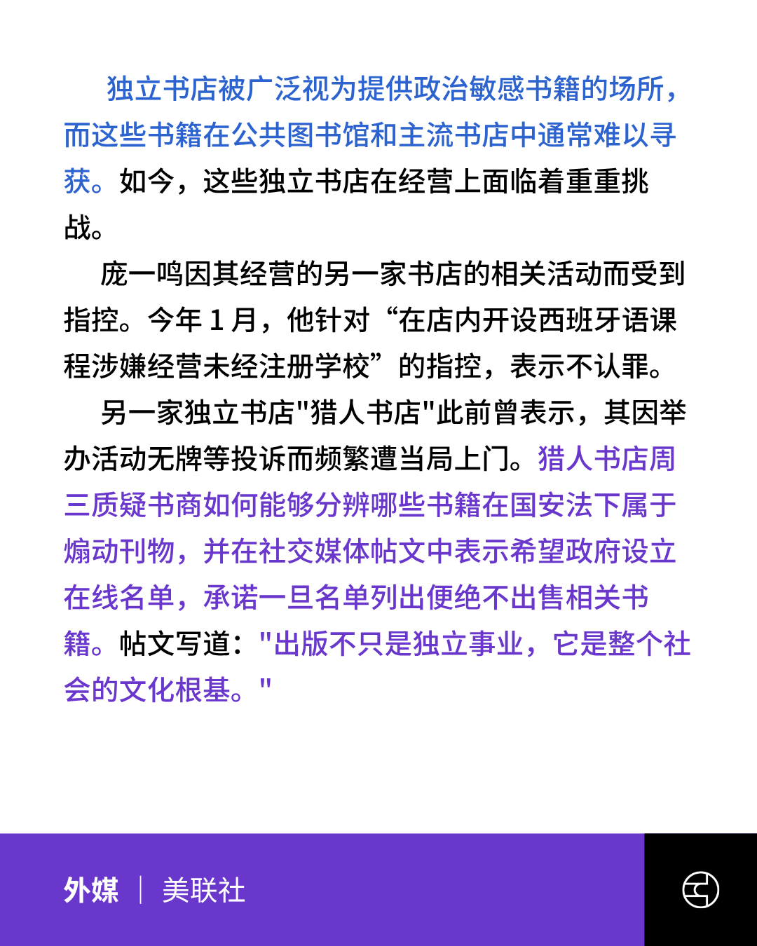 据路透社报道,《黎智英传》作者祁福德回应称,因出售一本关于新闻工作者入狱经历的传记被控煽动”既悲哀又讽刺”。另一独立书店”猎人书店”呼吁政府公布煽动刊物名单,质疑书商无法辨识哪些书籍违法。文旅局局长罗淑佩被问及会否设煽动刊物名单,她回应称已有人被捕,不便评论。