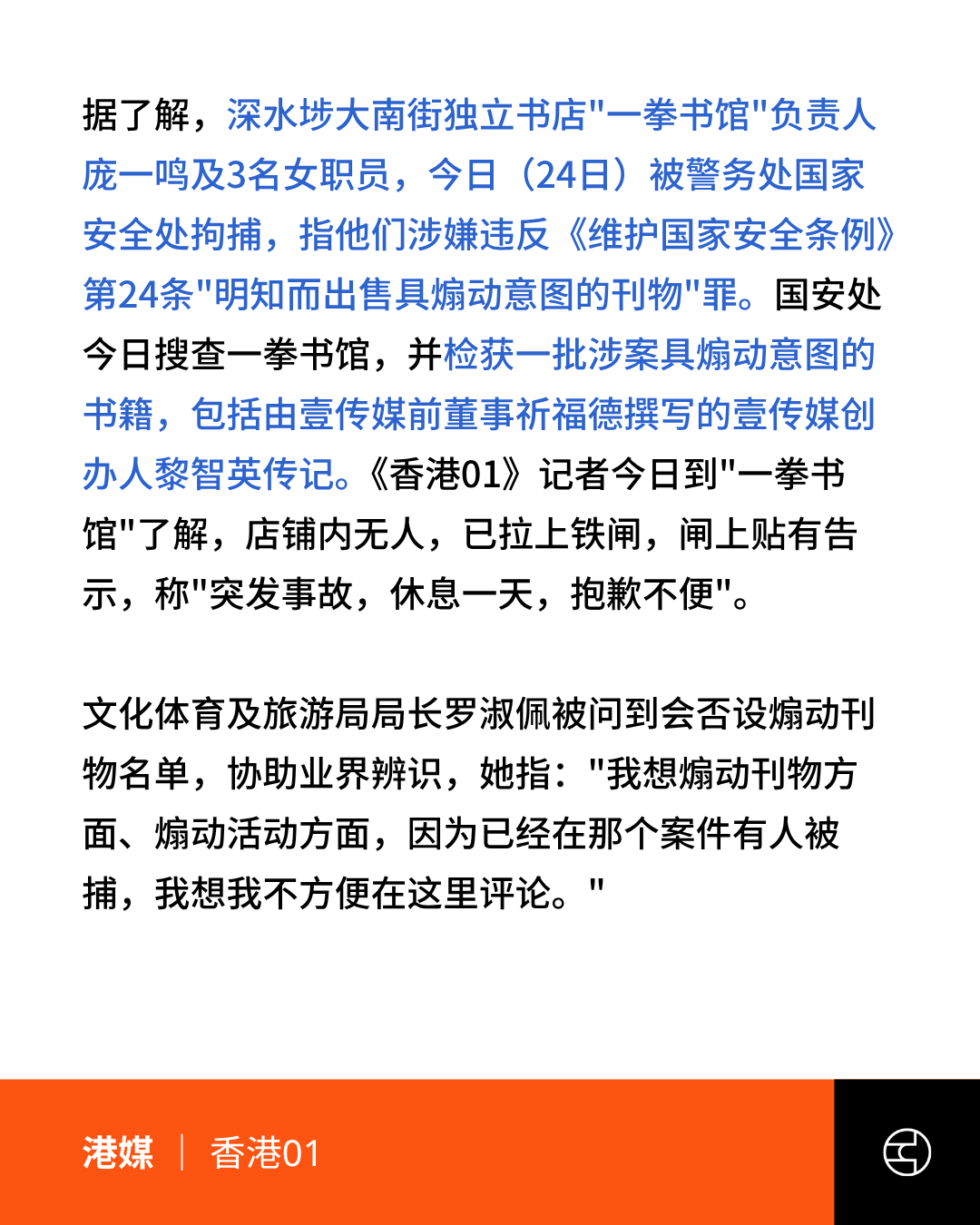《香港01》消息:国安处拘”一拳书馆”负责人庞一鸣及3职员 涉卖煽动刊物
