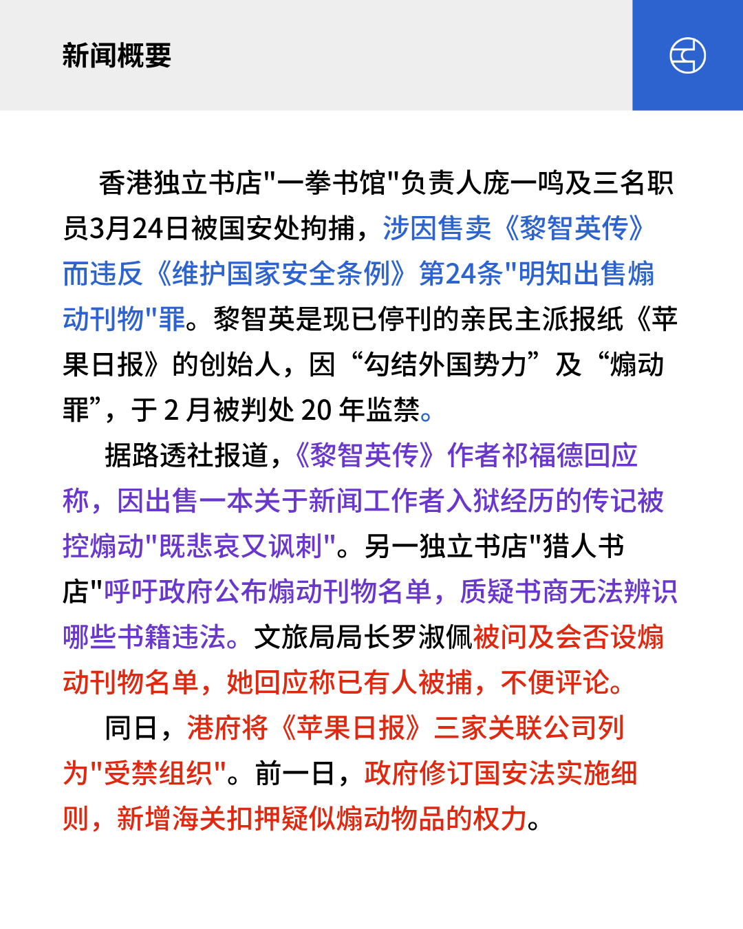 香港独立书店”一拳书馆”负责人庞一鸣及三名职员3月24日被国安处拘捕,涉因售卖《黎智英传》而违反《维护国家安全条例》第24条”明知出售煽动刊物”罪。黎智英是现已停刊的亲民主派报纸《苹果日报》的创始人,因“勾结外国势力”及“煽动罪”,于 2 月被判处 20 年监禁。
