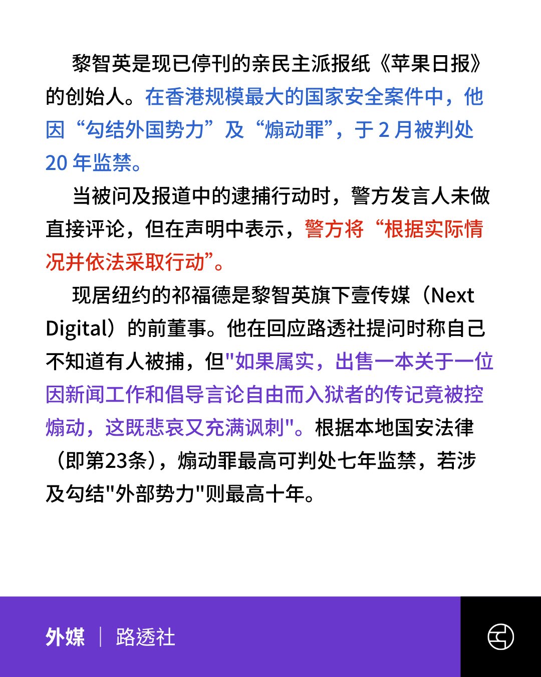 《路透社》Hong Kong police arrest bookstore owner, staff for selling Jimmy Lai biography, TVB says