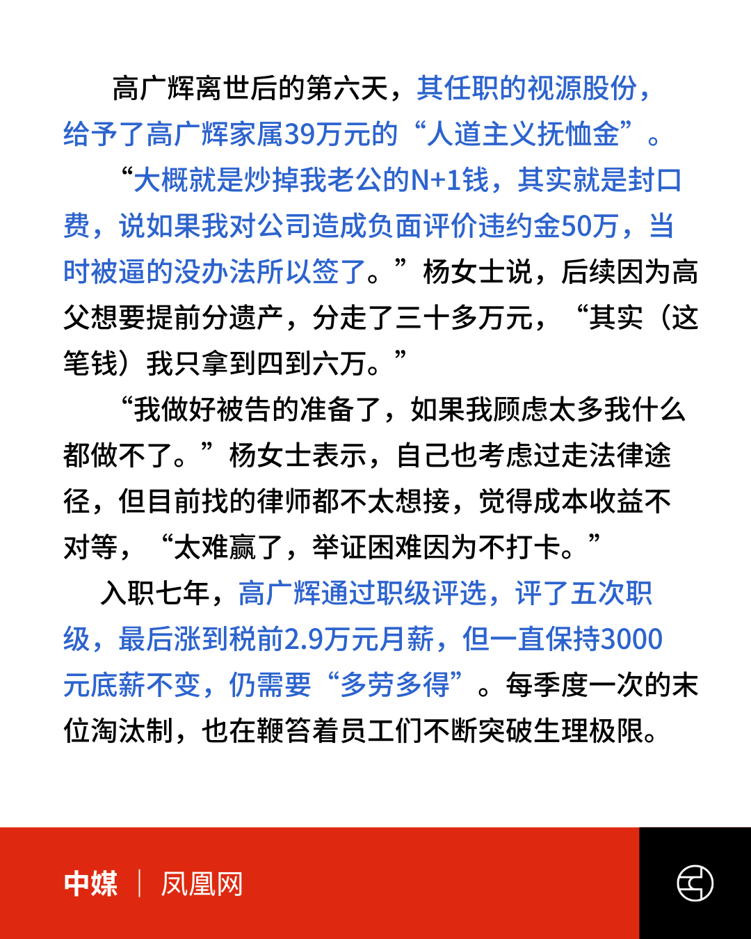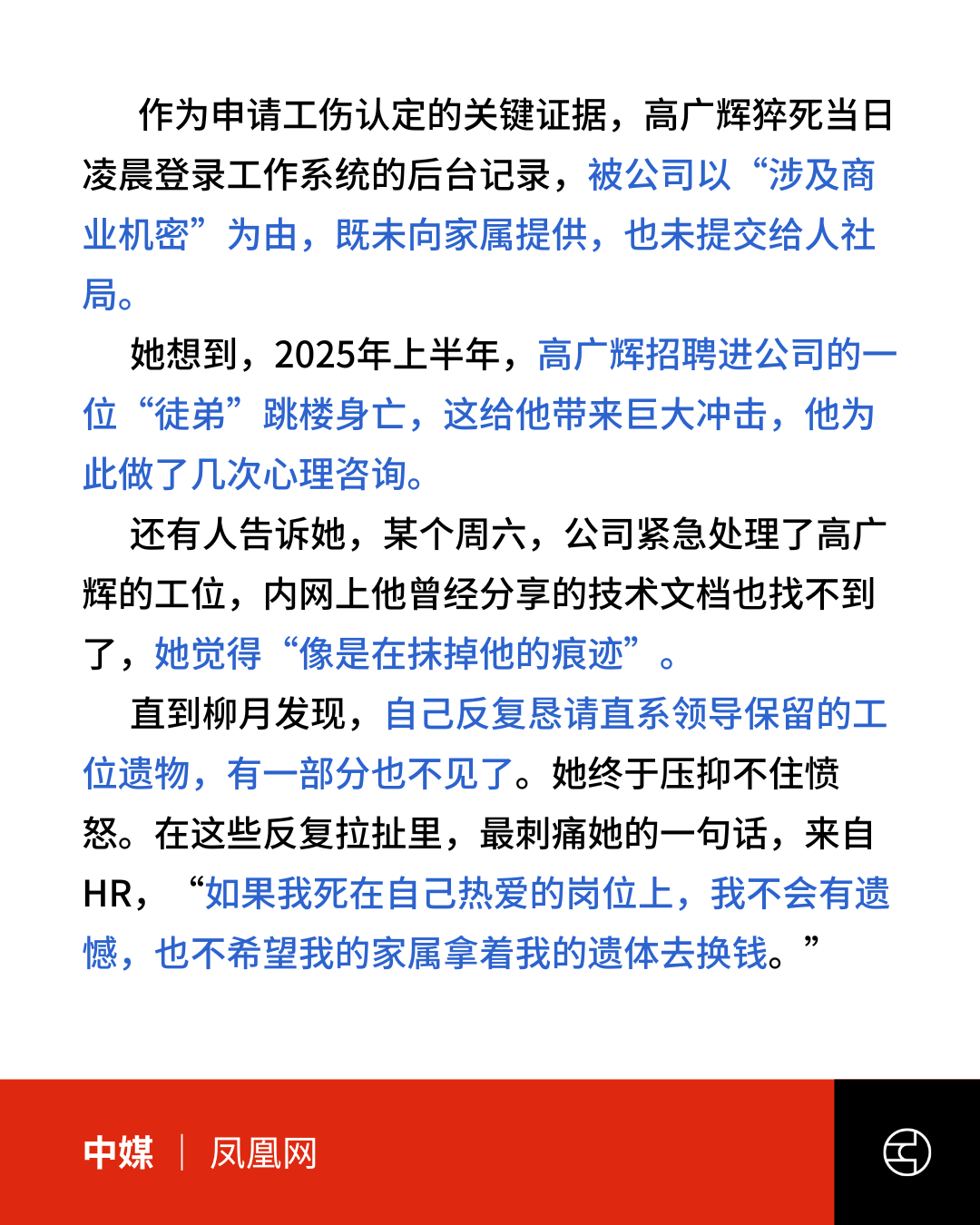 据称,公司HR向家属称“如果我死在自己热爱的岗位上,我不会有遗憾”,又暗批家属“拿着他的遗体去换钱”。