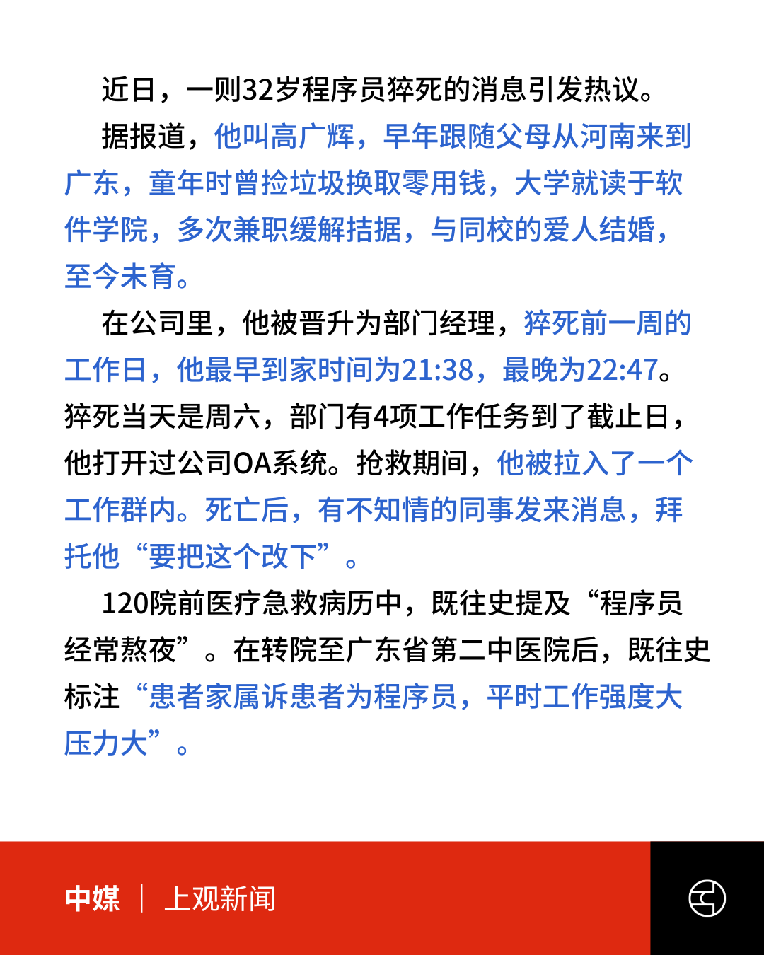 《上观新闻》32岁程序员周末晕倒后猝死,抢救期间曾被拉入工作群,工伤申请已被受理