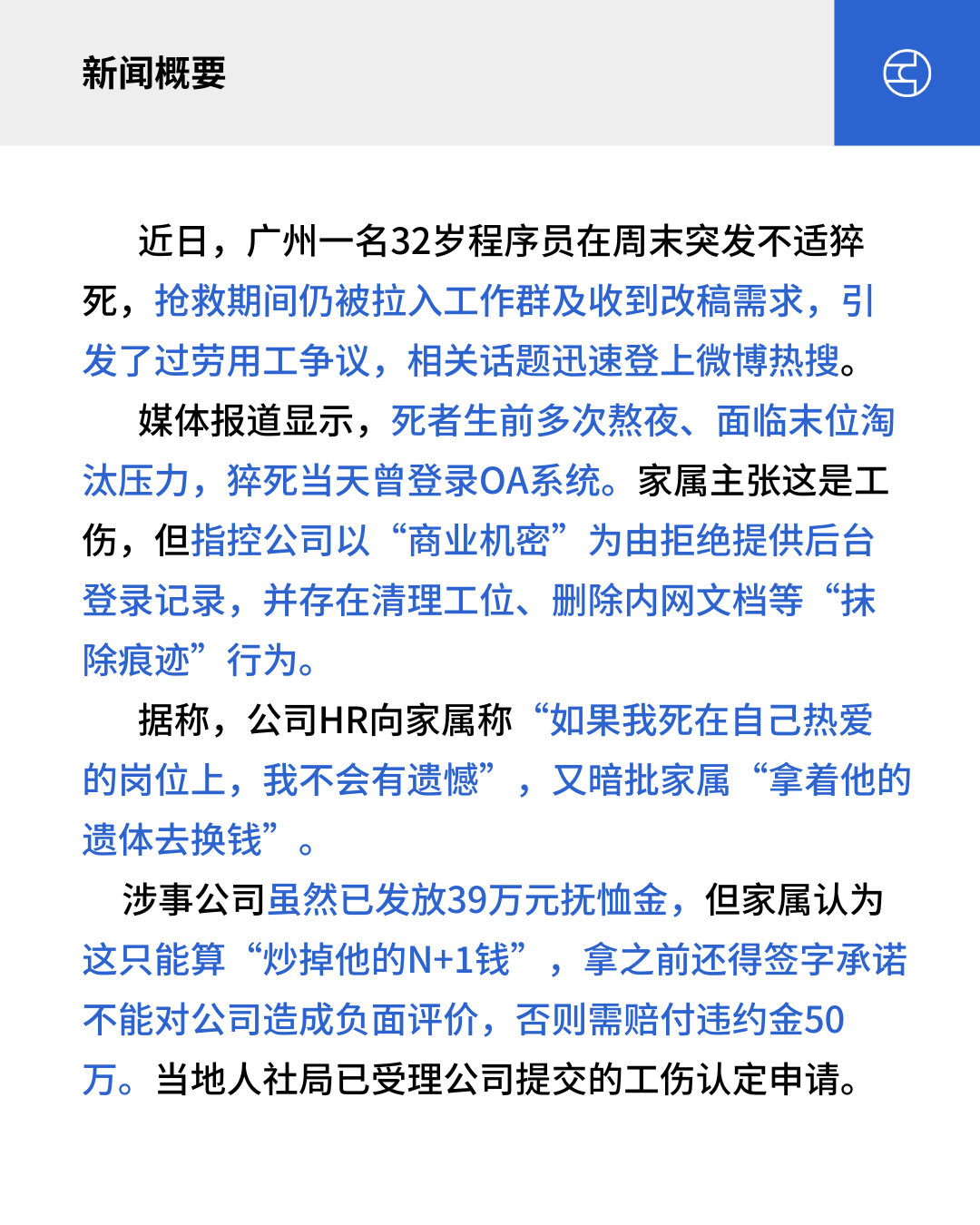 近日,广州一名32岁程序员在周末突发不适猝死,抢救期间仍被拉入工作群及收到改稿需求,引发了过劳用工争议,相关话题迅速登上微博热搜。