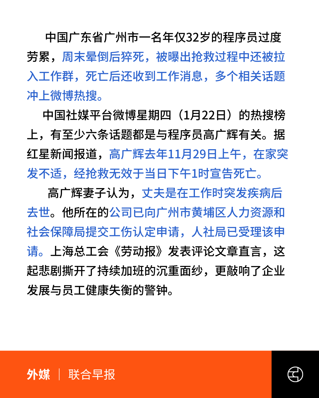 《联合早报》广州32岁程序员猝死 抢救期间仍被拉入工作群