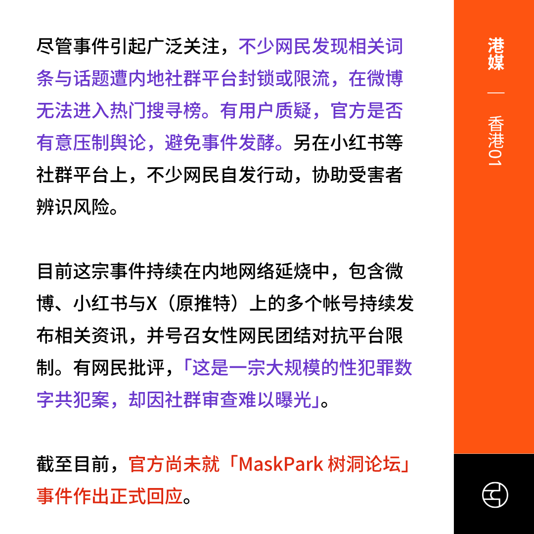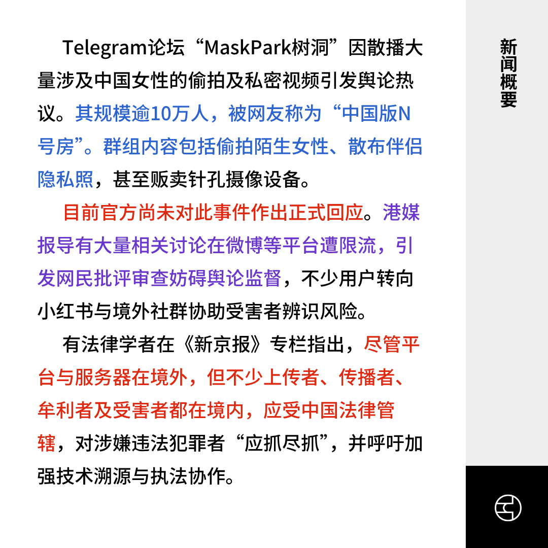 Telegram论坛“MaskPark树洞”因散播大量涉及中国女性的偷拍及私密视频引发舆论热议。其规模逾10万人,被网友称为“中国版N号房”。群组内容包括偷拍陌生女性、散布伴侣隐私照,甚至贩卖针孔摄像设备。