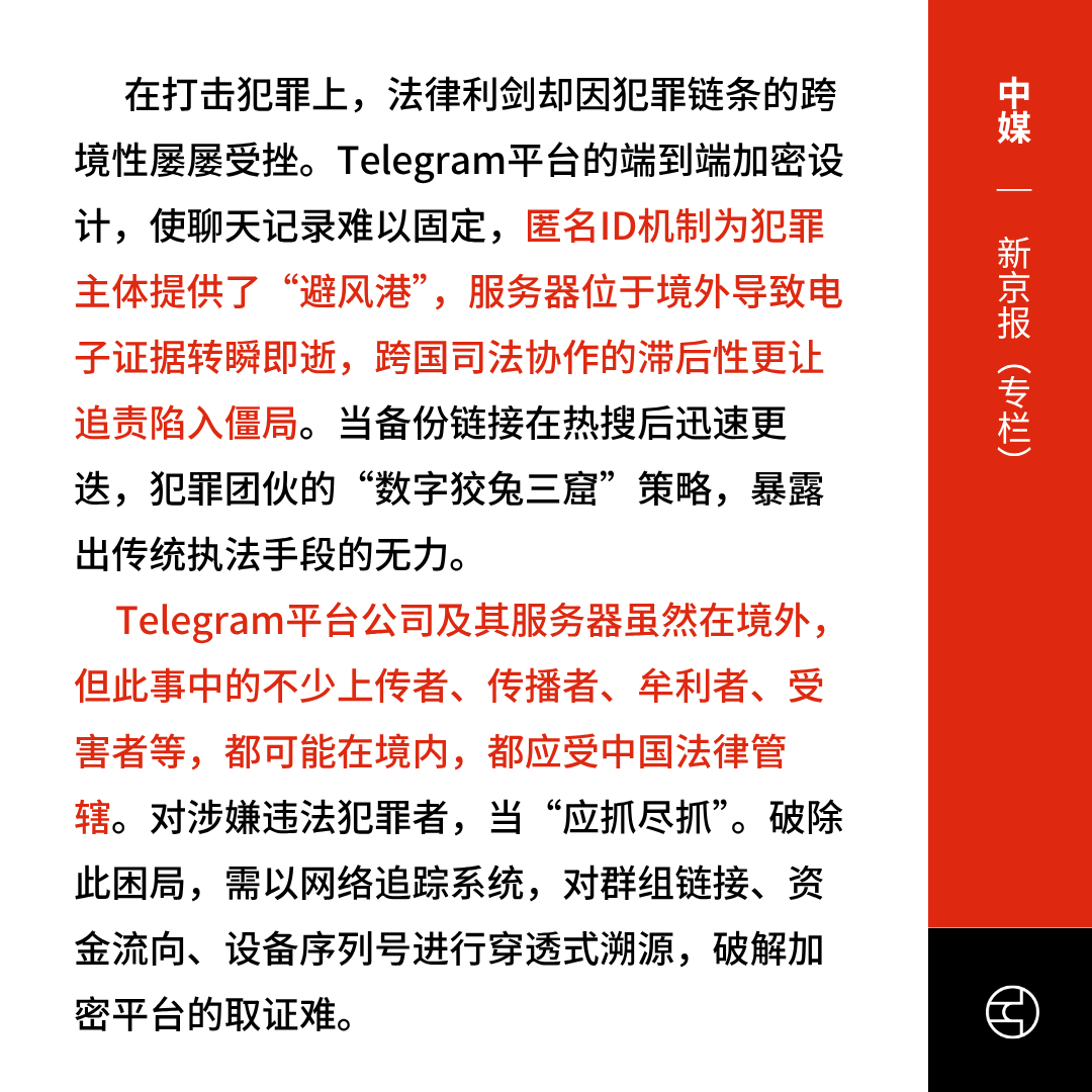 有法律学者在《新京报》专栏指出,尽管平台与服务器在境外,但不少上传者、传播者、牟利者及受害者都在境内,应受中国法律管辖,对涉嫌违法犯罪者“应抓尽抓”,并呼吁加强技术溯源与执法协作。